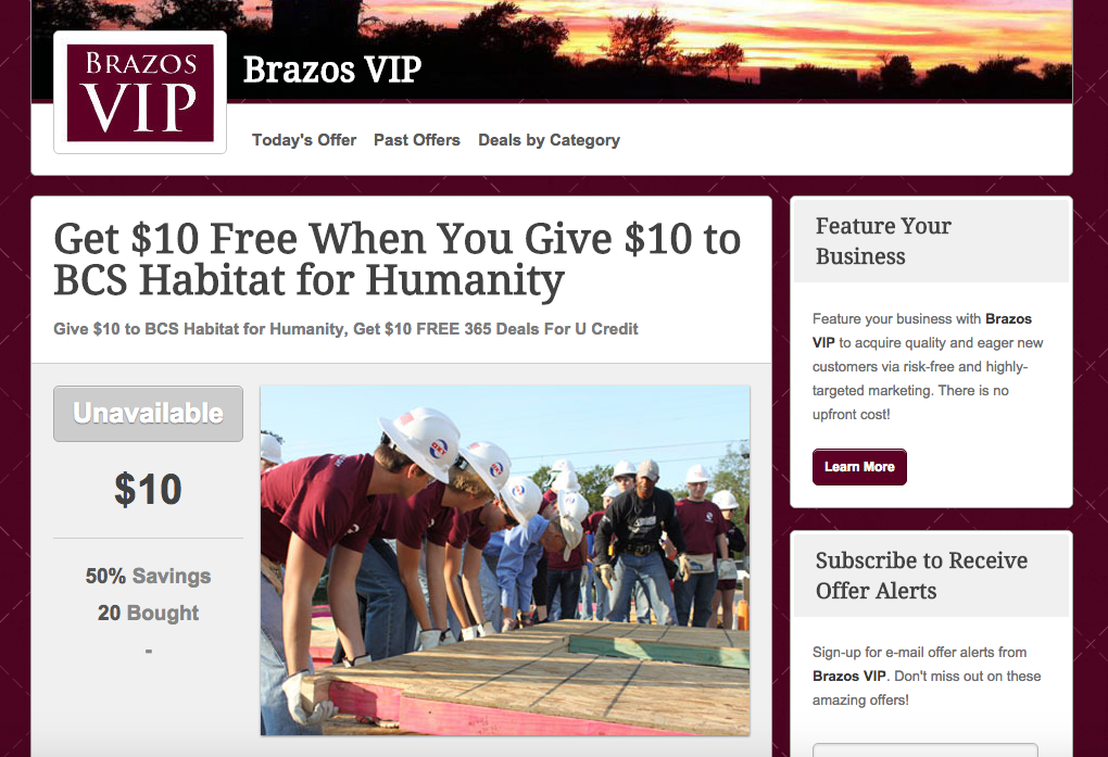 Brazos VIP founder David Flash says, “Giving back to our community and helping publicize great local causes has not only paid dividends in the warm and fuzzies we feel working for Brazos VIP, it has paid off in sales. The best marketing time and dollars we have invested for our online deal sites have been our charity partnerships and our ‘give/get’ deals.”
