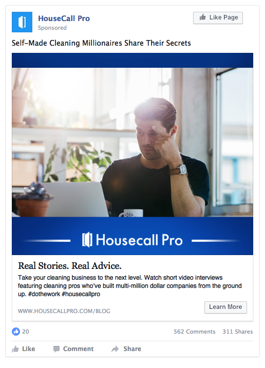 This campaign is part of first steps toward that end, building HouseCall Pro’s YouTube Audience. It will in a voice that speaks to Business Owners who operate cleaning service companies and either are millionaires or aspire to be.